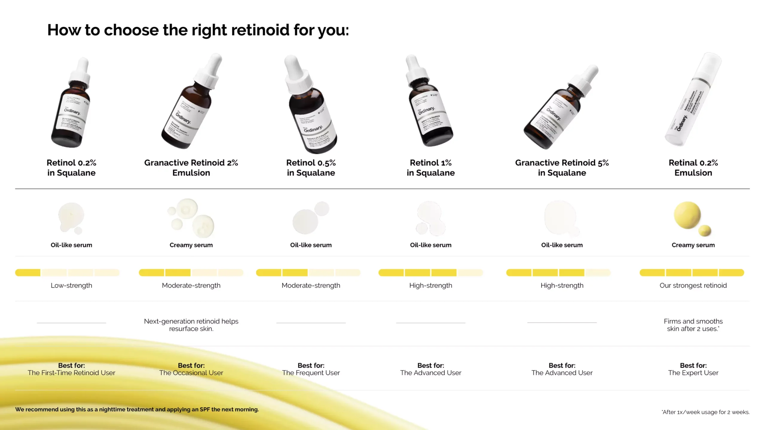 So now that we’ve covered more about retinoids, how they work, and some key regimen tips, how do you choose the right retinoid for you and your skin concern? Again, pairing retinoids in a skincare regimen starts by gradually incorporating by strength, depending on whether you’re a beginner, intermediate, or an advanced user of retinoids.